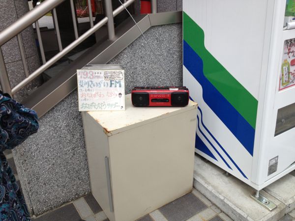 建物の左側にラジカセが置かれていて、建物内から発信している音・声を流していました。いつもサイマルラジオで聞いていた声が、ここから流れ隣で放送されていた。建物の写真をツイッターで女川さいがいFMのツイッターに、「福島からきましたよー!」とツイートしておきました。このツイートを見てくださって、このあと返信をもらうことに。それはまたあとで。
